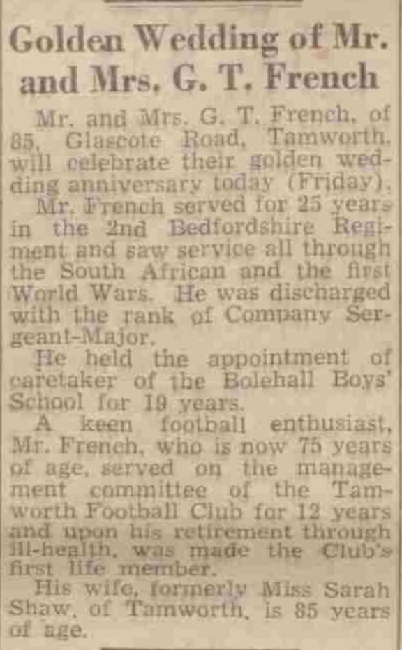 On 8th October 1948 George and Sarah celebrated their Golden Wedding Anniversary. In recent years he had been given the honour of being Tamworth Football Club's first ever Life Member, having served on its management committee for 12 years. I'm sure he would have been thrilled with Tamworth's recent promotion to the National League.