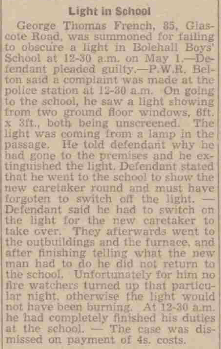 In May 1943 George was approaching retirement at 70 years old. He was fined 4 shillings costs for showing a light in the school during the blackout while he was showing a new caretaker round the building.