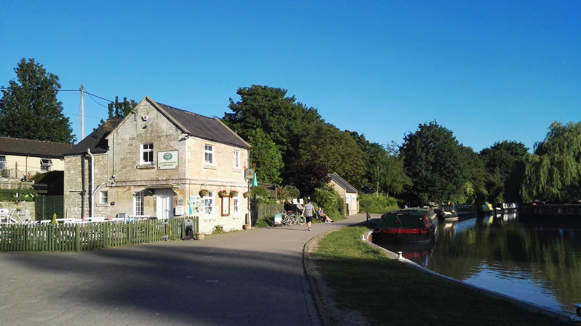 There were small wooden lockkeepers’ huts, with a tiled roof and a chimney, beside locks 29 and 43, but these fell into disrepair and were demolished many years ago. There are also some canal cottages on the south side near Lock 39. Caen Hill Locks Tea Room and the Caen Hill moorings lie between locks 44 and 45.