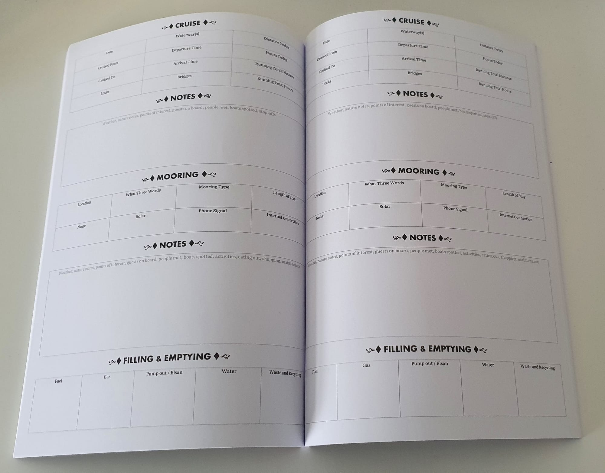 The next 75 pages are neatly set out to journal your cruising logs and mooring memories.