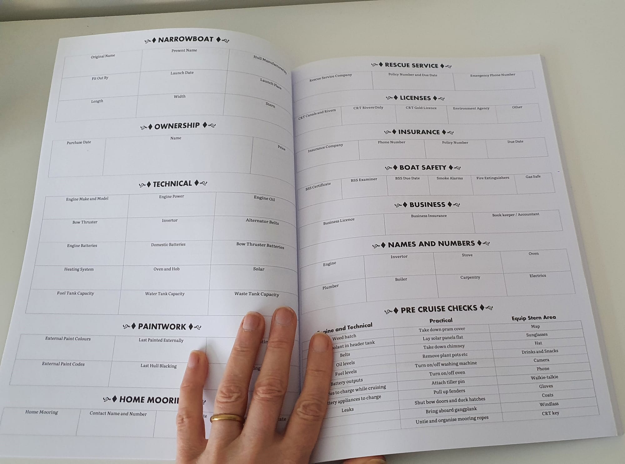 Here's what you can find in my book. The first two pages are for essential information about your boat, useful contact numbers, and reminders of your pre-cruise checks.