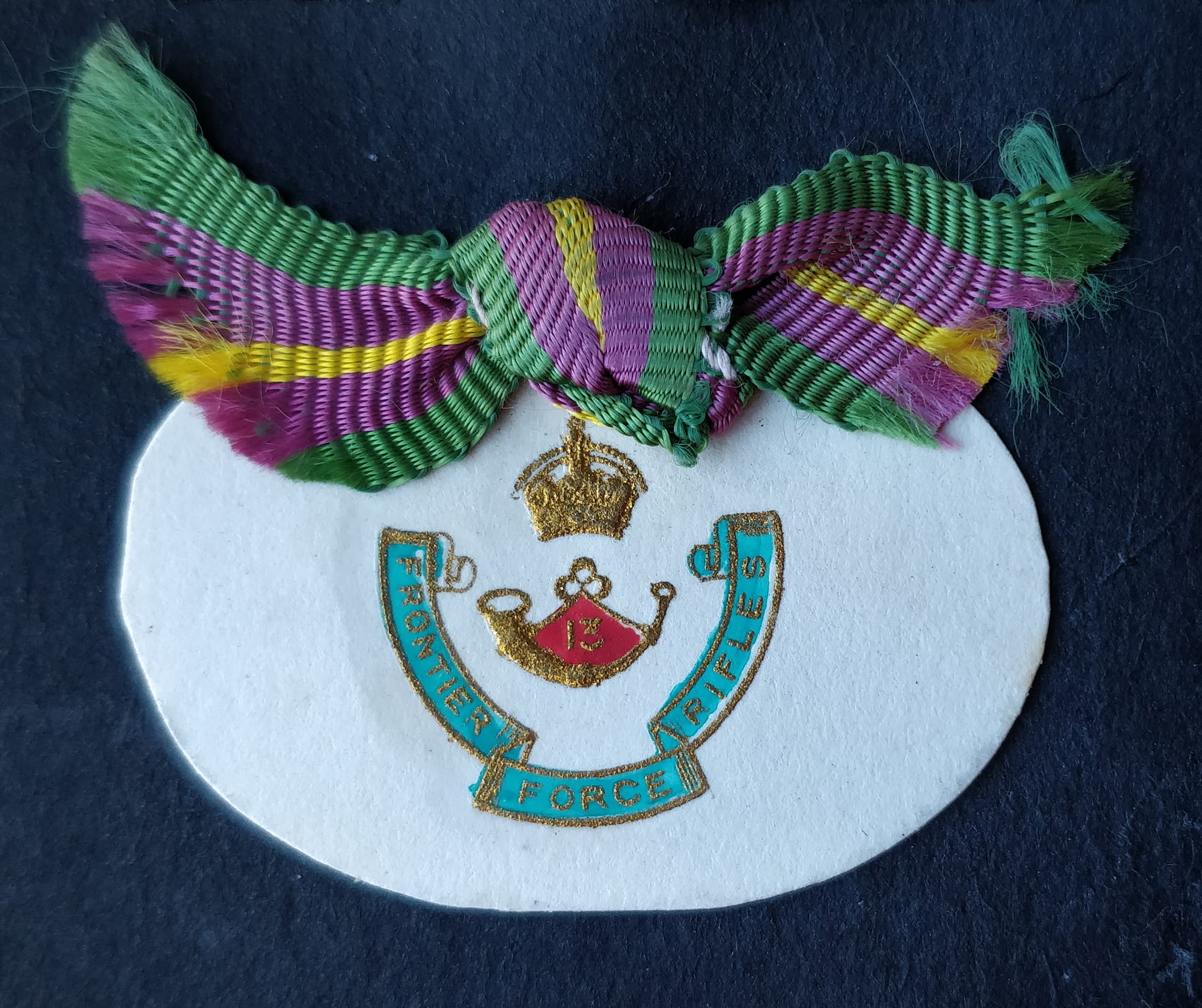 When my mother went to India as a VAD Nurse in 1945, she was allocated a young officer as an escort, Richard Blake of the North West Frontier Force Rifles, who was also known as Dick. He served either in the 13th Frontier Force Rifles, or the 4th Battalion (Wilde’s) Frontier Force Rifles. His badge is a single star with the acronym IMA, which stands for Indian Military Academy.