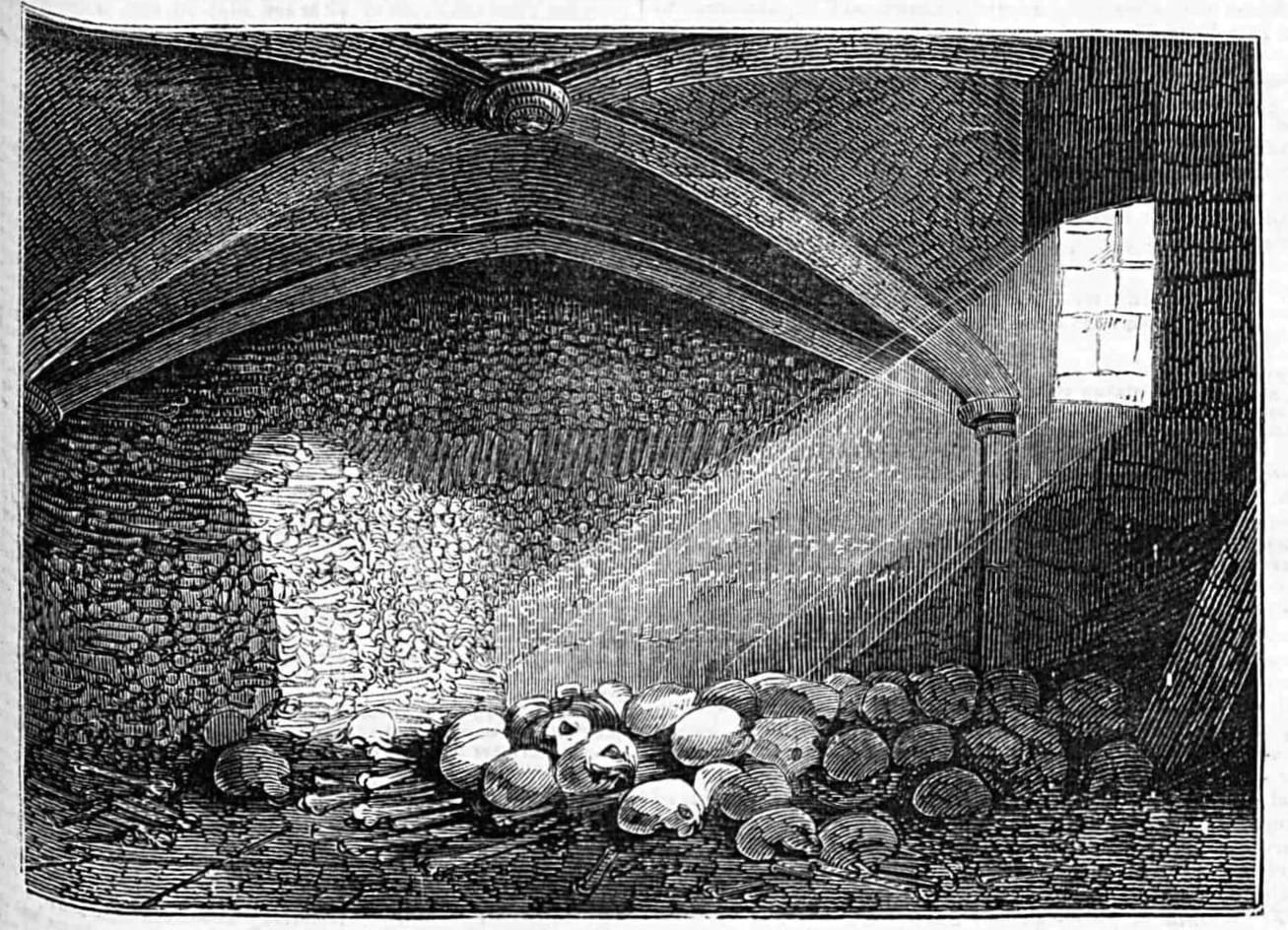 Francis wrote: “The light peers into the solemn space by a narrow window, half buried in earth and wall, upon a mound, or rather a stack, of human bones. The effect is striking. The beaming rays from the world of quick mortality above, fall upon the relics of the unremembered.”